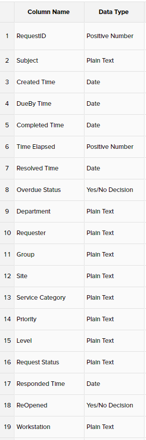 SELECT "RequestID","Subject","Created Time","Requester","Resolved Time","Completed Time","Responded Time","Time Elapsed","Category","Department","DueBy Time","Group","Impact","Level","Mode","Overdue Status","Priority","ReOpened","Request Status","Service Category","Service Request","SLA","Urgency","Workstation" FROM Request