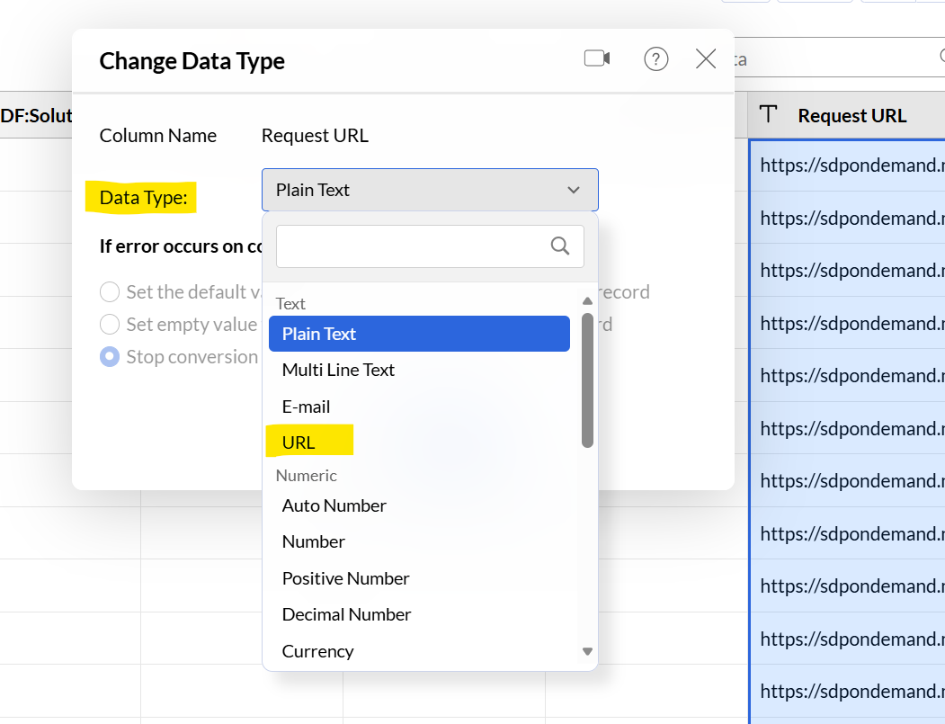 Once the formula column is created, right-click on the 'Request URL' column and choose 'Change Data Type' and select 'URL' from the drop-down list.
