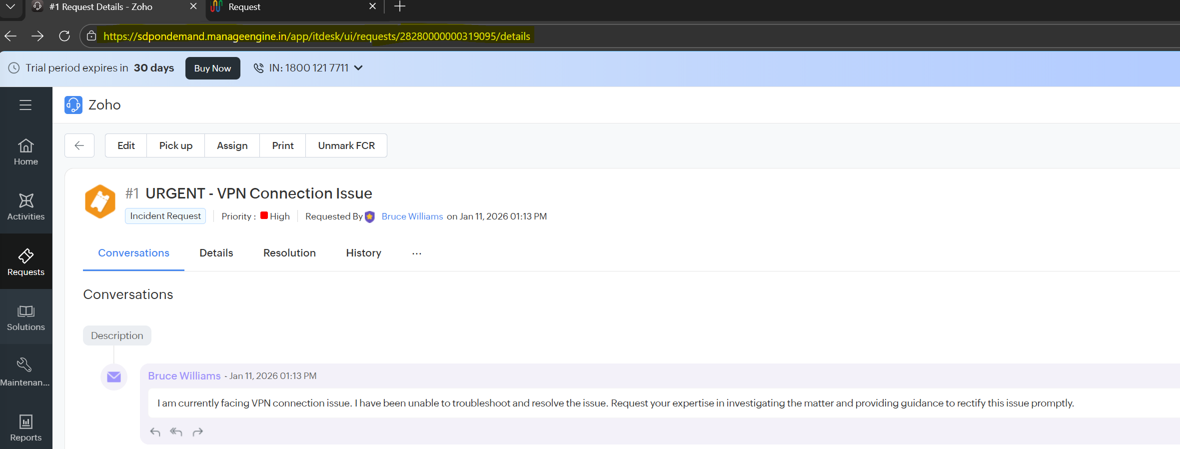 Open a Request in ServiceDesk Plus Cloud and copy the URL in the address bar as shown below.