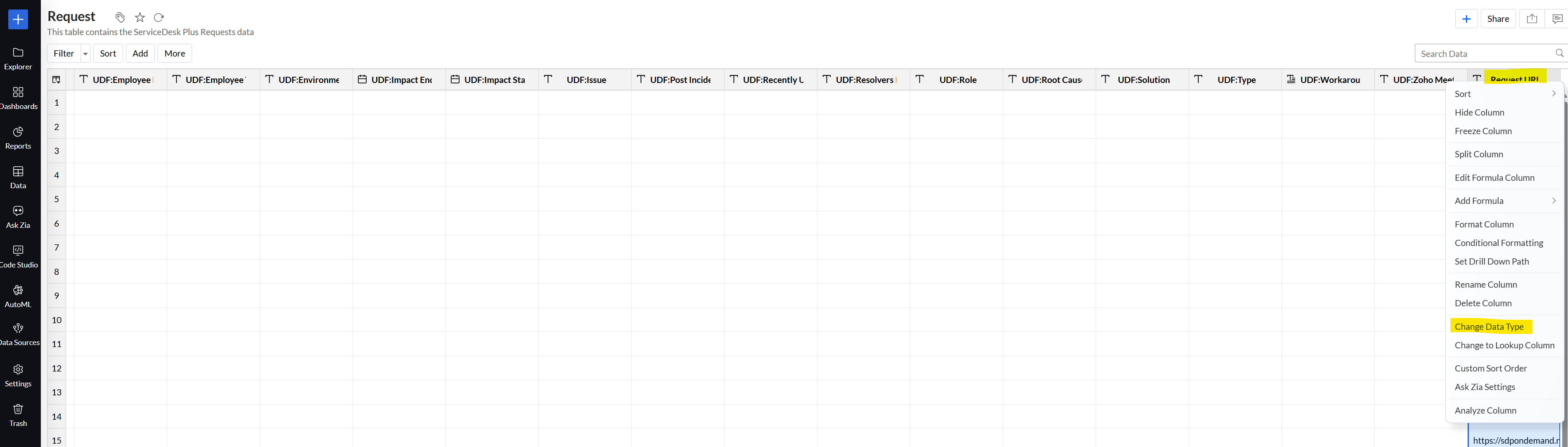 Open 'Request' table in Analytics Plus Cloud and click on 'Add' and select Formula Column to create a custom formula for Request ID URL in Analytics Plus.
