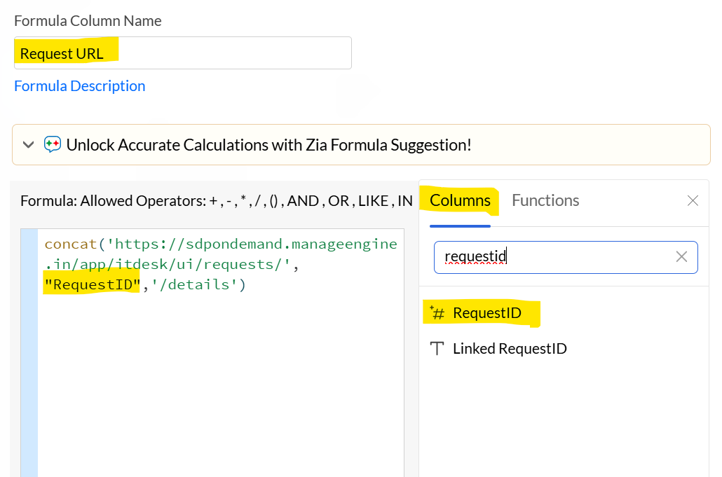 Use the 'concat' function to join the URL taken from ServiceDesk Plus (Refer step 1) and the 'Request ID' from the column listed.