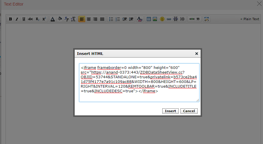 Step 5: On the Insert HTML window, paste the iframe copied from the report (copied from step 2) and click Insert: