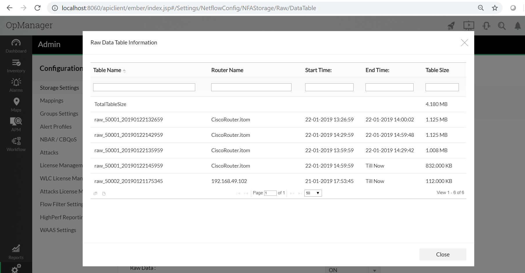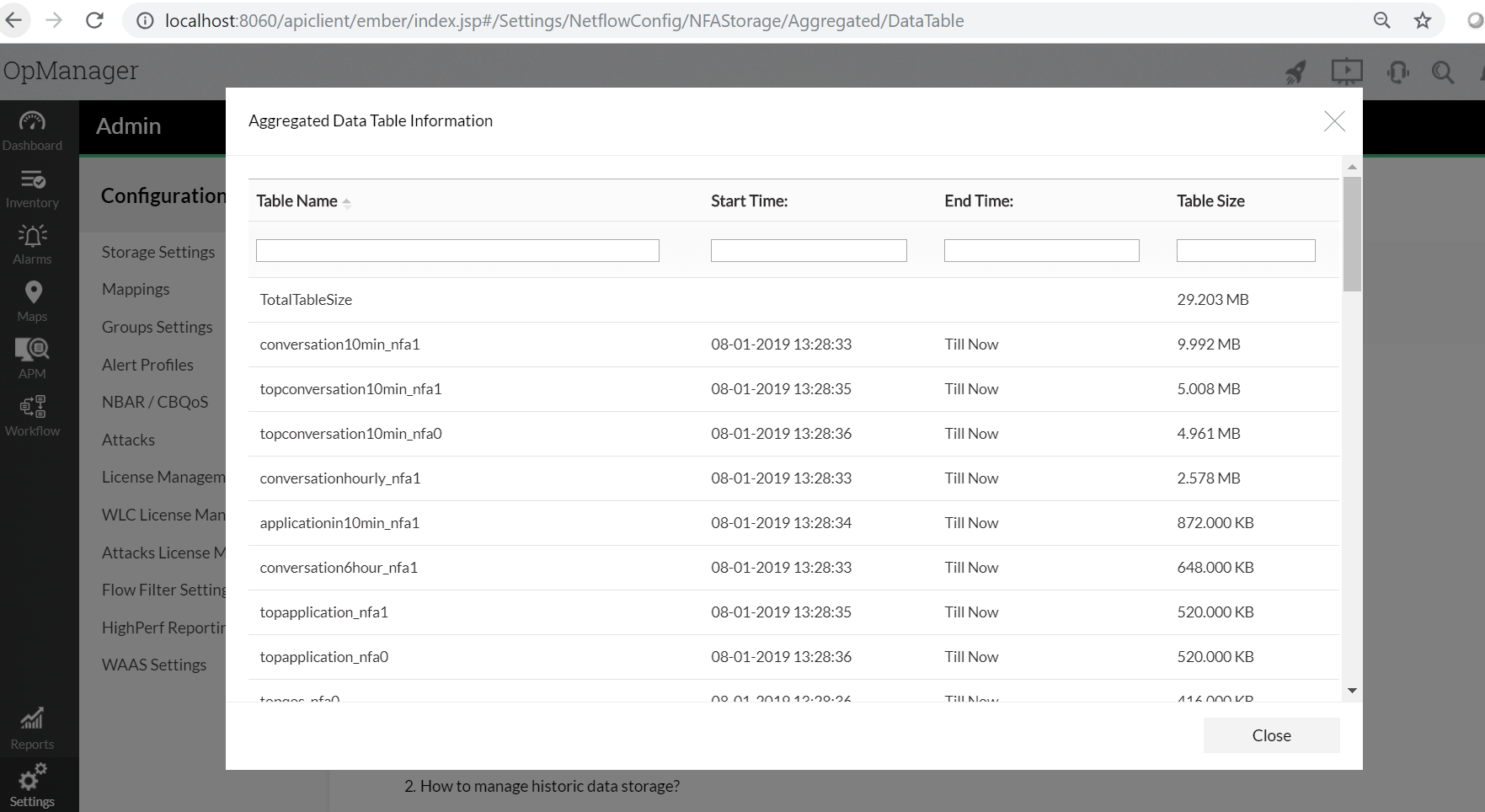 - NetFlow Analyzer stores two kinds of data(i.e RAW data and Aggregated data), we can separately get the total amount of table space taken by NFA by modifying URL.