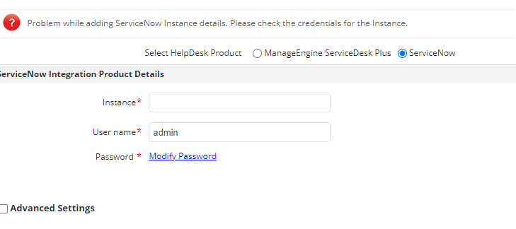 Problem: The following error pops up while trying to add a ServiceNow instance: