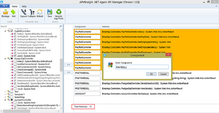 3. Choose required methods / classes or even entire assemblies from left pane and add it to the right pane for monitoring. The number of methods selected will be shown at the bottom.