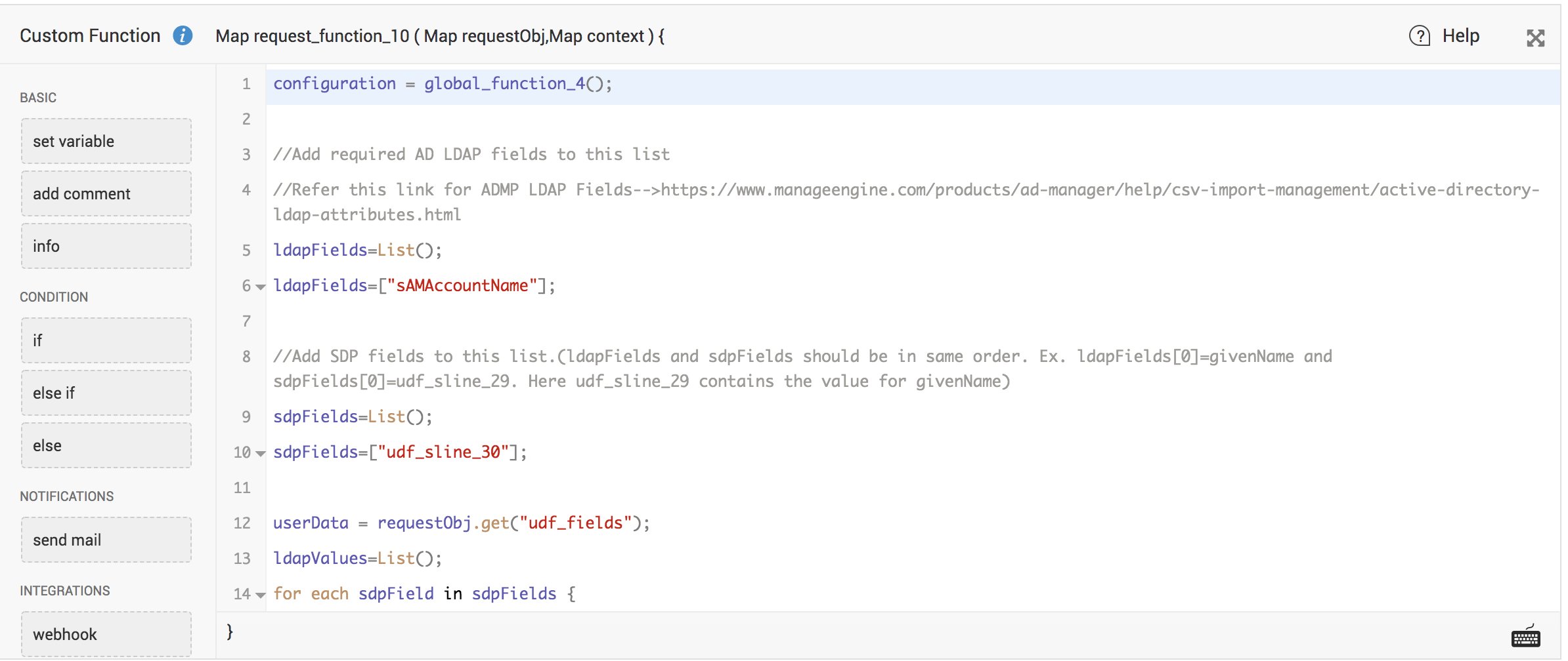 Add API field names (of ServiceDesk Plus additional fields) and LDAP field values (of ADManager Plus fields) to the script after ensuring that they are mapped correctly.