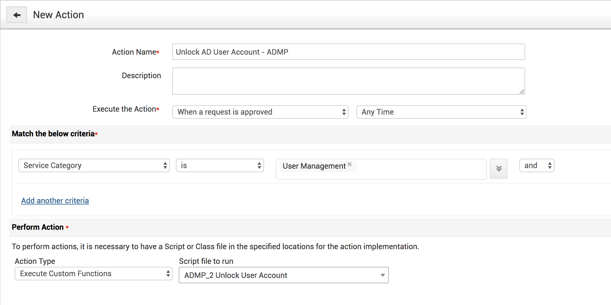 3. Under Admin >> Request Custom Function > Custom Action >> New, write a script to automatically unlock employees in your Active Directory. You can call the global function to this actionable part of the custom function.