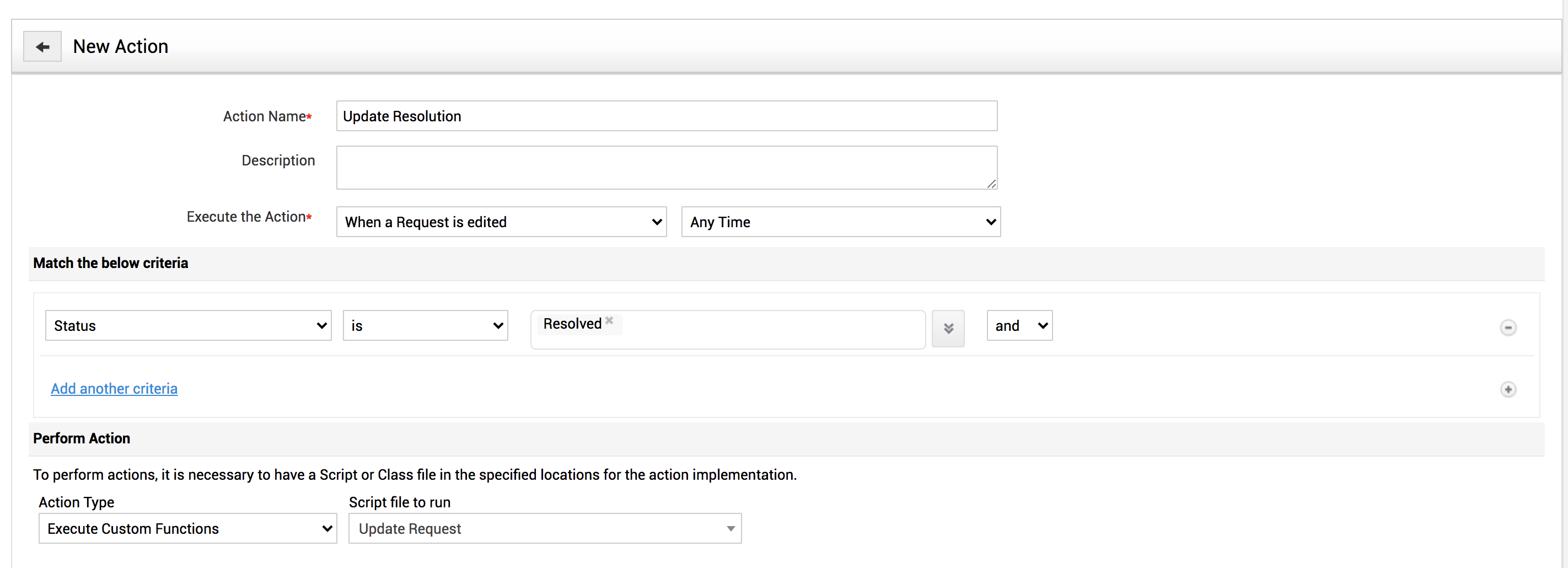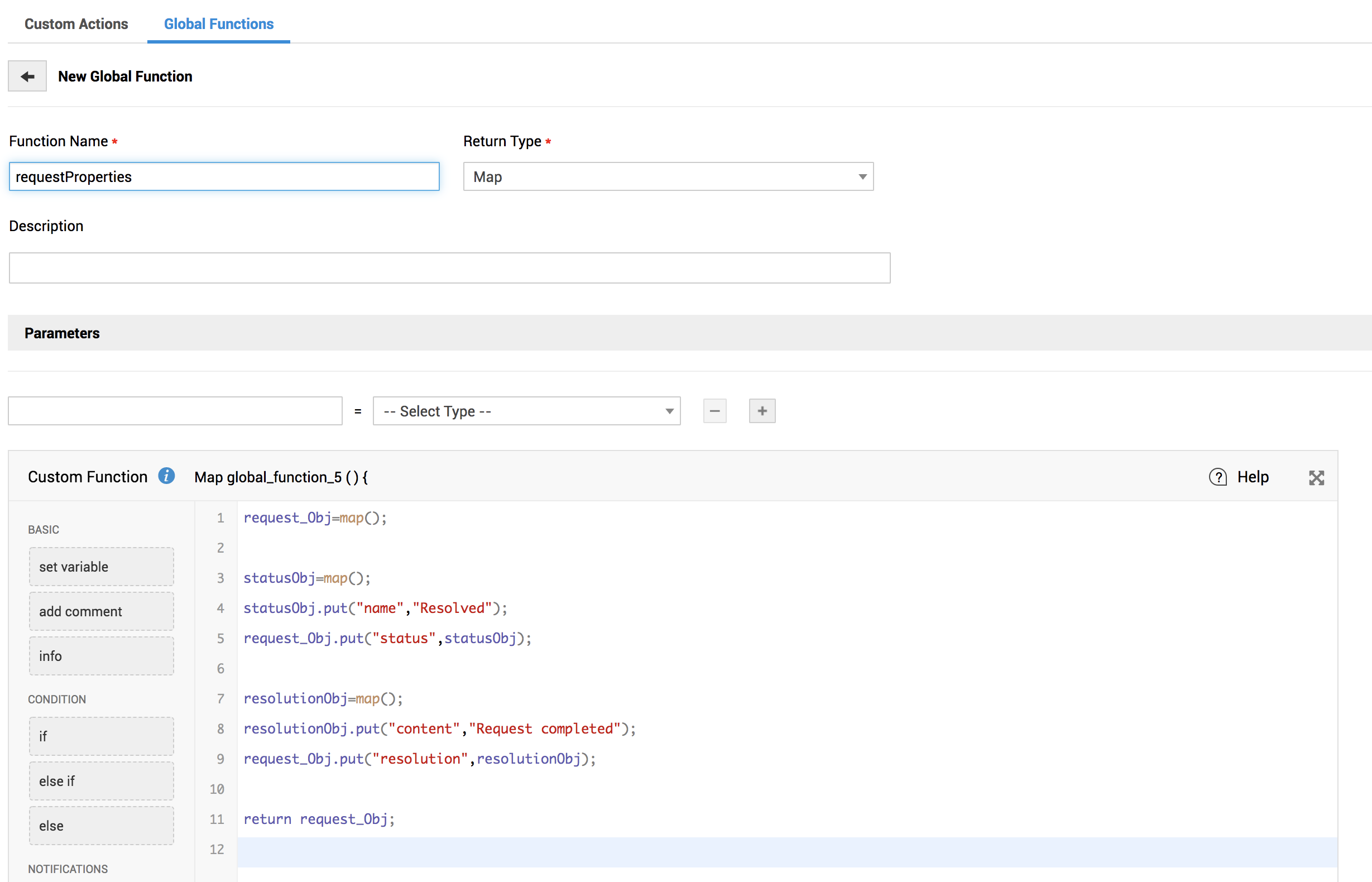 For example, If you need to add a resolution automatically as soon as the technician changes the status of the request as 'resolved', we can update the resolution content in a custom global function. When the technician changes the status to resolved, this script invokes and the resolution is added based on the value given in the global function.