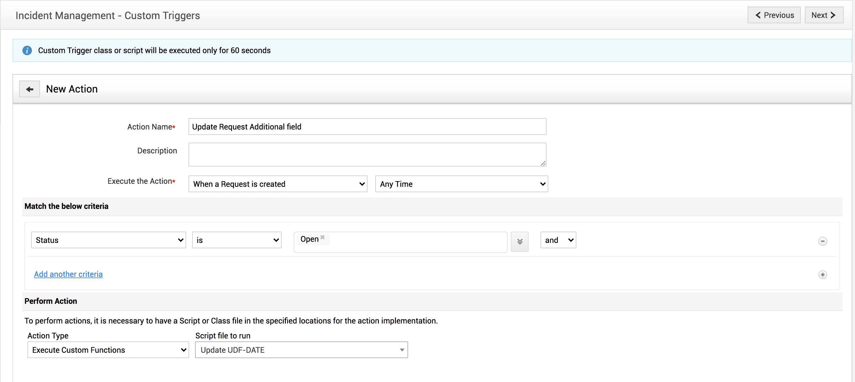 3. Configure the created custom function in a custom trigger to get executed when the request is created.