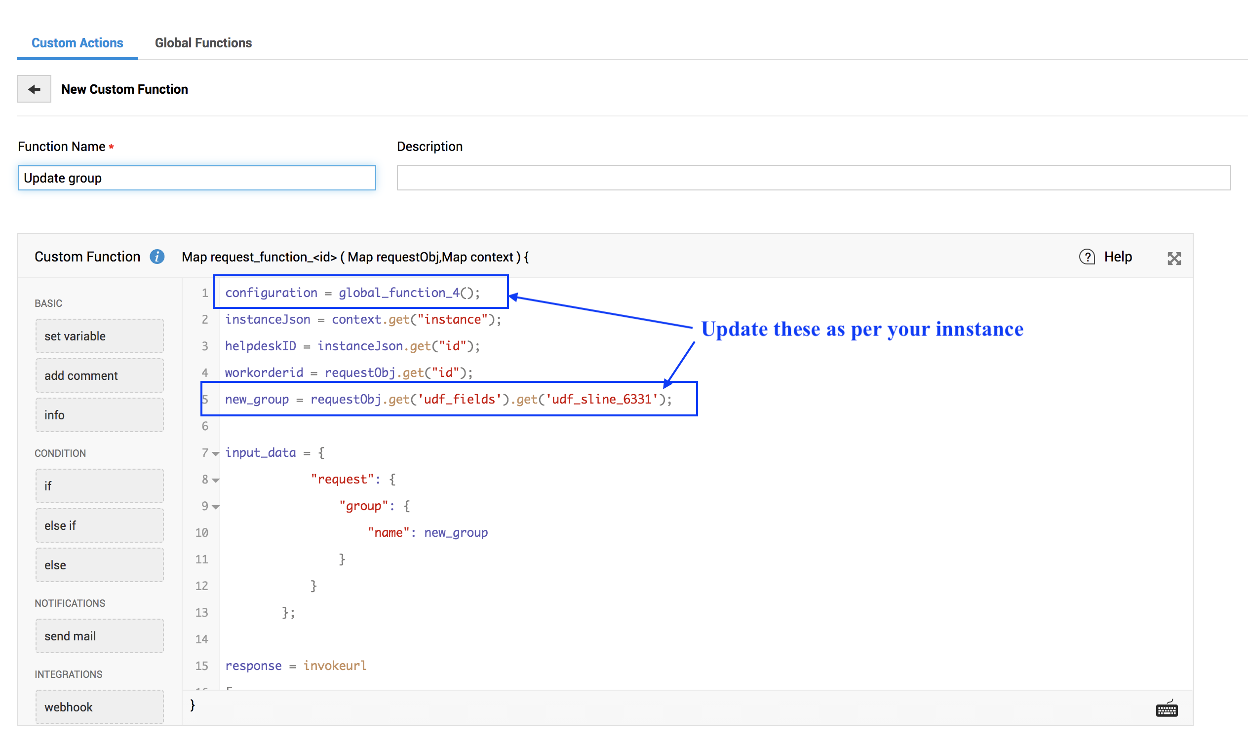 3. Goto Admin > Request Custom Function > Custom Function > New > Paste the update_group.txt content and save it with a name