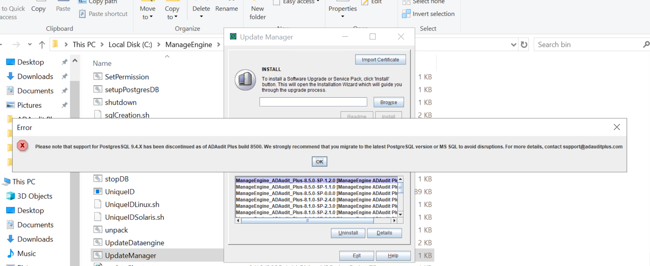 Attempting to upgrade ADAudit Plus without upgrading PostgreSQL results in compatibility errors.