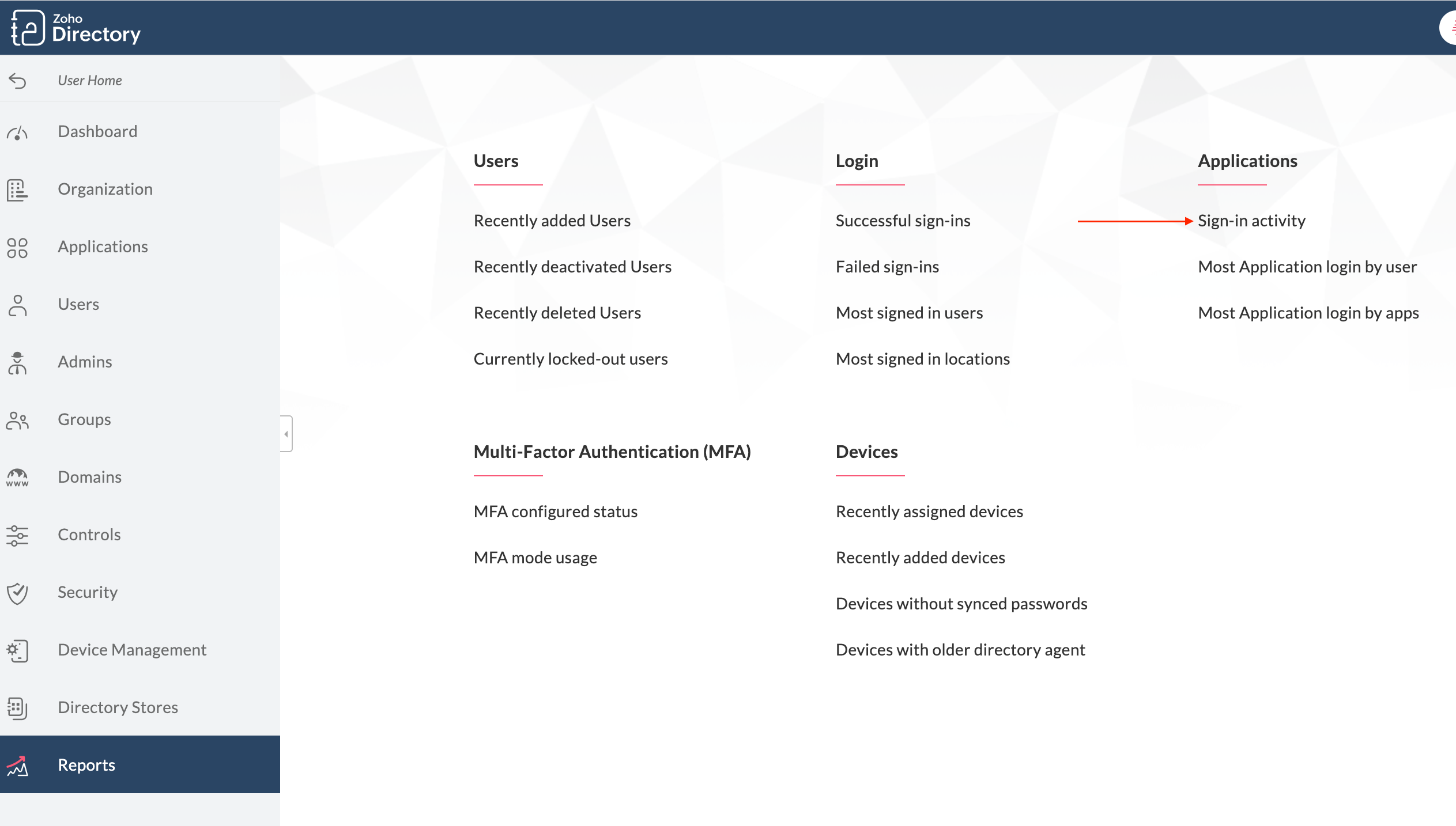 You can export the sign-in activity report from Zoho Directory. Kindly navigate to Zoho Directory > Reports > Sign-in Activity