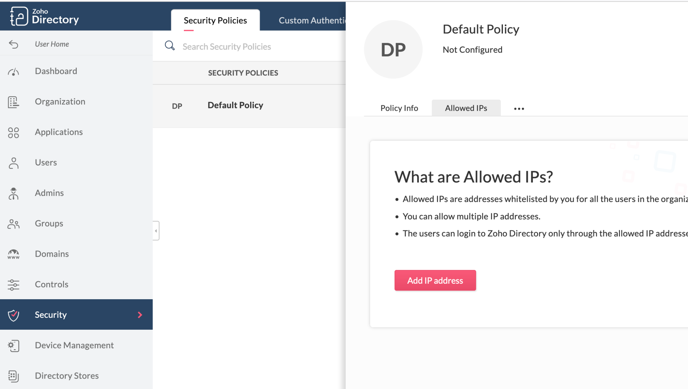 We recommend configuring the allowed IP addresses in Zoho Directory to enhance your organization's security. Whitelisting specific IPs helps prevent unauthorized access by ensuring that only users connecting from approved IP addresses can access your organization. Once this configuration is in place, access will be restricted exclusively to the specified IP addresses.