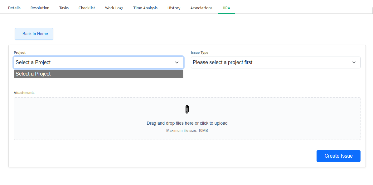 Although the connection has a green icon, which suggests that there is connectivity to the Jira service with the configured credentials, when we try to create a Jira ticket, there are no projects listed in the projects drop-down list.