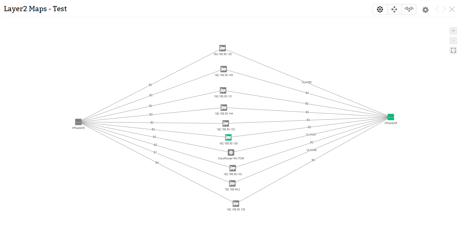 The relationship data in layer2 maps is added over the relevant CIs under their relationship map. For example, the relationship between HP Switch and a workstation (192.158.50.130) in the Layer2 map will be automatically populated in the relationship map of both CIs (HP Switch and 192.158.50.130) under CMDB.