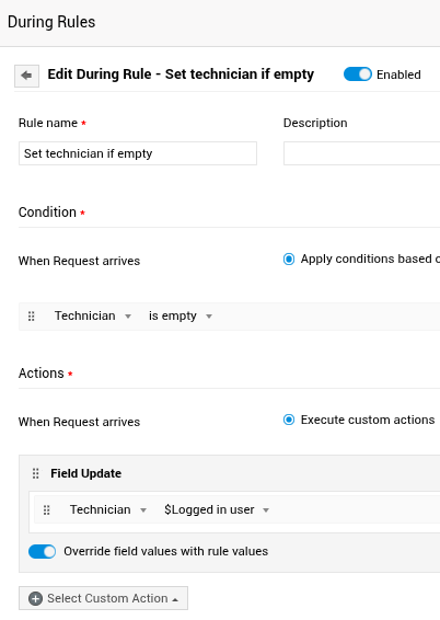 The trouble we're now having is that if the Requester answers by e-mail, Servicedesk Plus will transition the ticket to Open anyway. When we then try to assign the ticket to a Support Group (unassigned) it triggers the transition rule for "Resume Work", detects that the technician field is empty and then sets the technician to the logged in user.